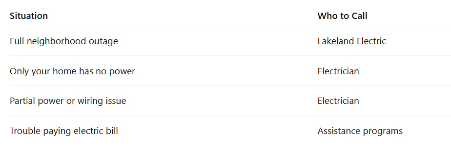 In Lakeland, that provider is Lakeland Electric. They handle outages that affect multiple homes or entire areas.