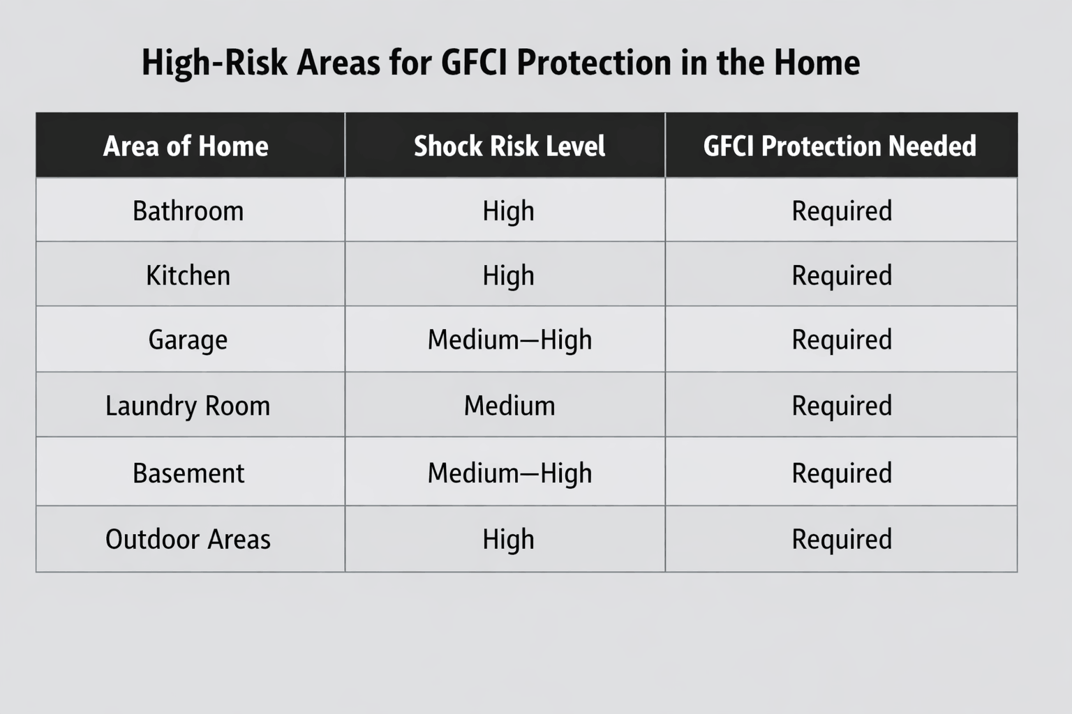 Weather-resistant GFCI outlets are typically used outdoors for added durability. Installing protection in these locations helps reduce shock risk caused by rain, standing water, or damp surfaces.
