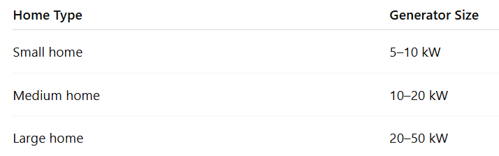 Most whole-house generators range between 10 kW and 25 kW. The exact size depends on your home’s square footage and the number of appliances. Homes with central air conditioning, electric heating, or multiple large systems may require a larger unit. A professional load calculation gives the most accurate result.