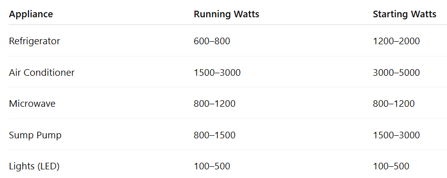 Here are common household appliances and their typical power needs: